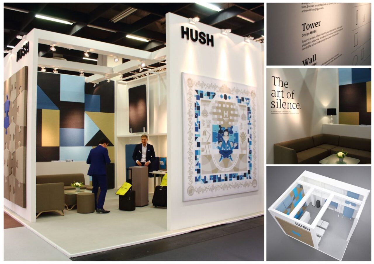 Ekspozycja wystawcy HUSH Creative Design Group, według projektu Tomasza Kwiecińskiego z firmy Meliński Minuth z Poznania, wykonanej przez Meliński Minuth na targach Orgatec 2016 w Kolonii.
